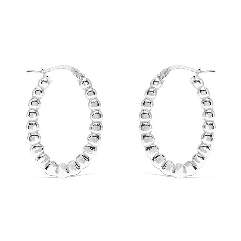 Hoop earrings made of 925 silver with shiny white 18K platinum plating in an urban chic design, shiny finish with bubbles and a special oval shape. Ideal for everyday modern chic looks.