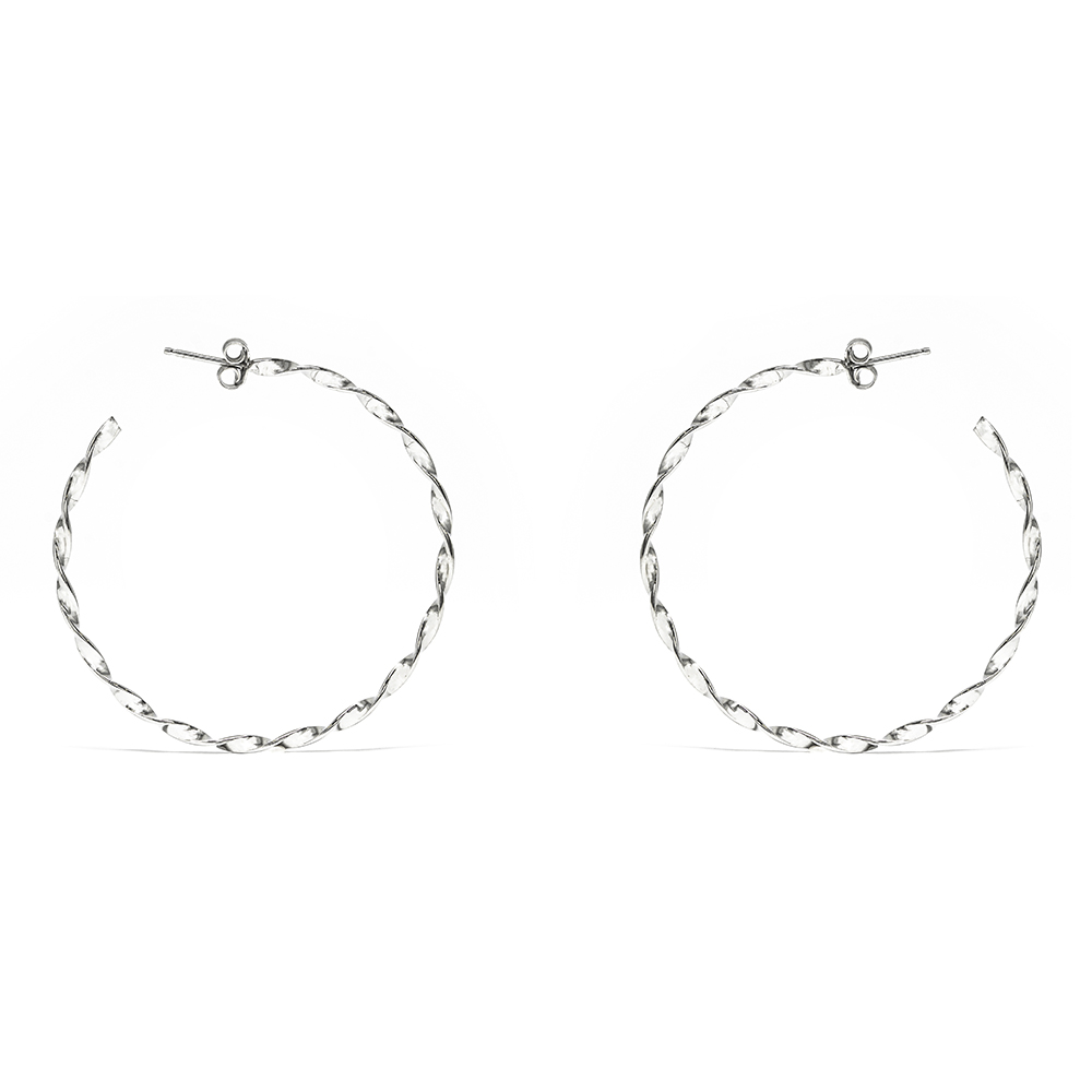 Hoop earrings made of 925 silver with shiny white 18K platinum plating in an urban chic design, shiny finish and impressive knitted processing in a round oval. Ideal for everyday modern chic looks.