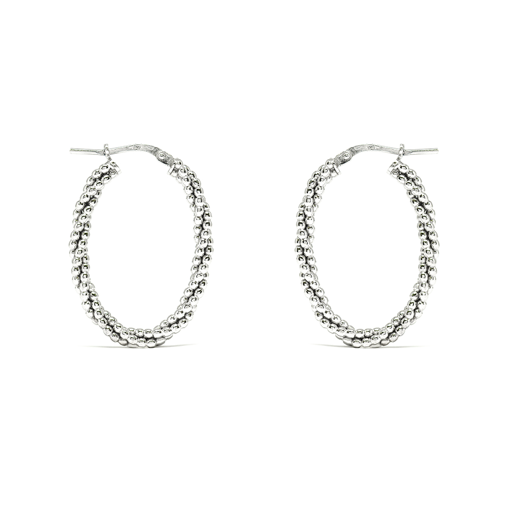 Hoop earrings made of 925 silver with shiny white 18K platinum plating in an urban chic design, shiny finish and impressive knitted processing in an oval shape. Ideal for everyday modern chic looks.