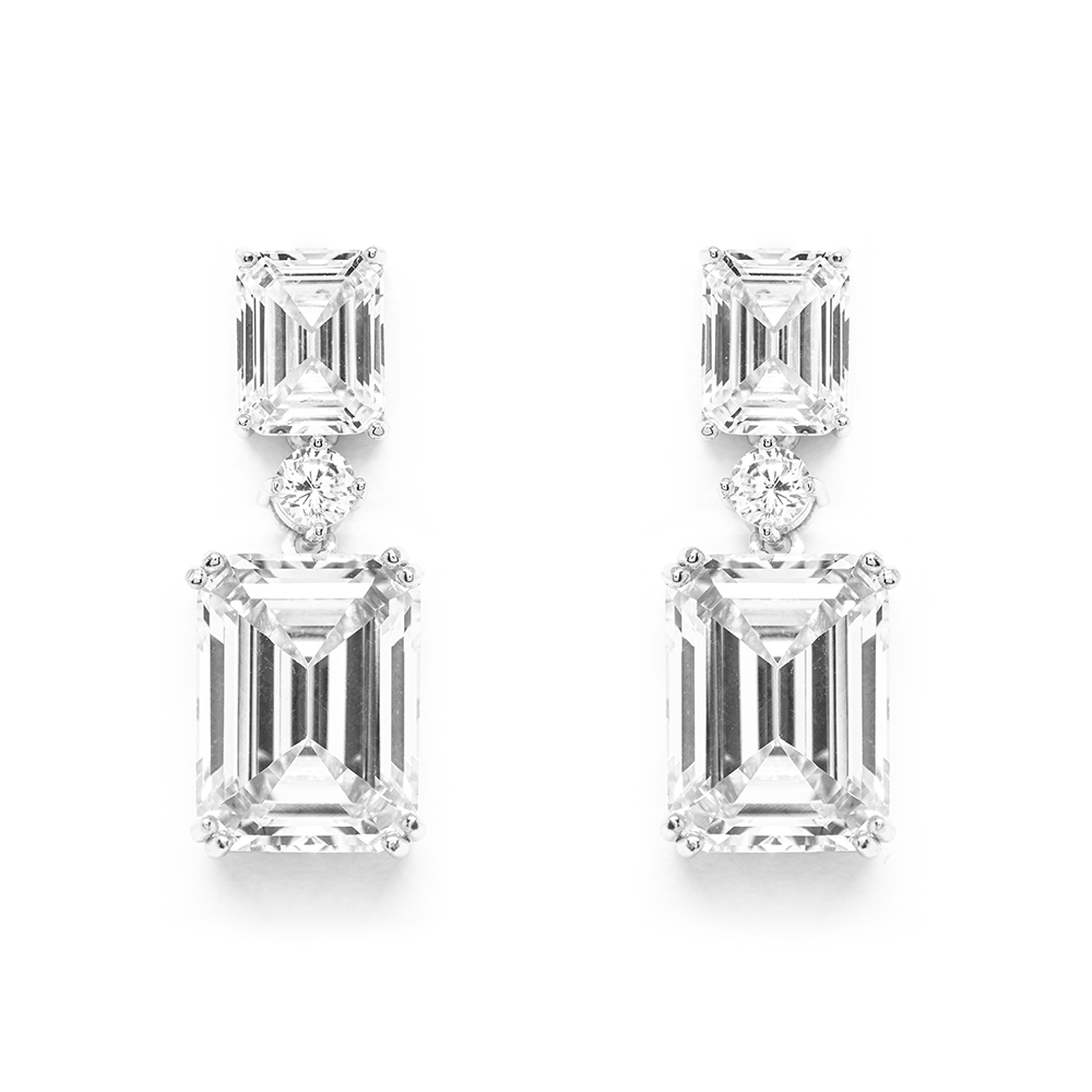 Silver and platinum-plated dangling earrings made of shiny 18K white gold with impressive crystal quartz in emerald shape. A jewel with a unique shine for sophisticated and distinctive appearances. .