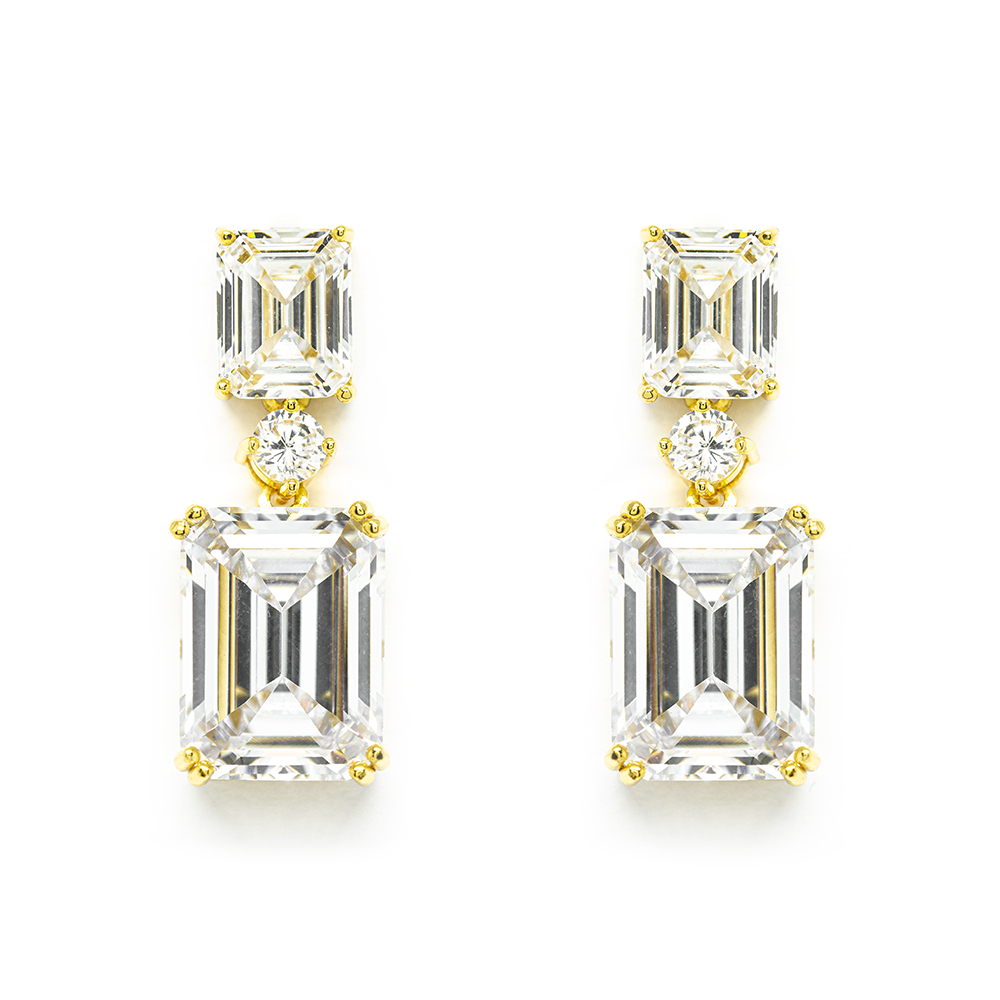 Silver and 18K yellow gold plated dangling earrings with impressive emerald-shaped crystal quartz. A jewel with a unique shine for sophisticated and distinctive appearances. .