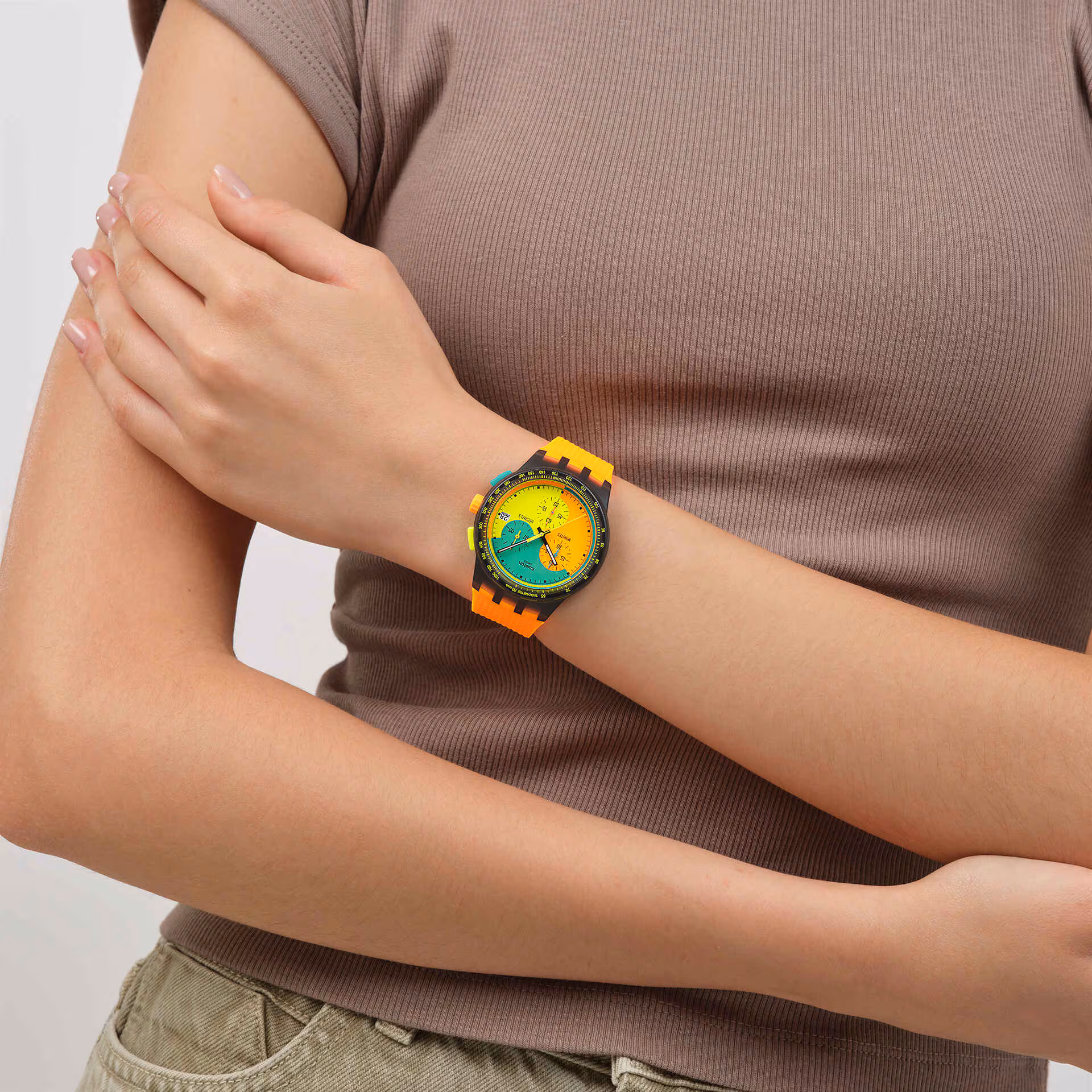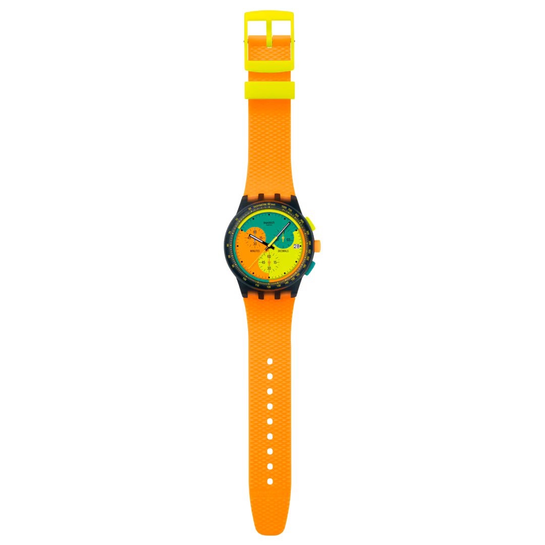 This retro chronograph is inspired by a Swatch CHRONO from the 90s: the collectible SIGNAL FLAG (SCN101). The multi-colored dial features black hour and minute hands with glow-in-the-dark effect, a yellow chronograph seconds hand, and a date window at 3 o'clock. The matte transparent black case is complemented by a matching bezel with a yellow printed tachymeter scale. A matte orange embossed strap with a matte yellow lug and clasp completes the watch.