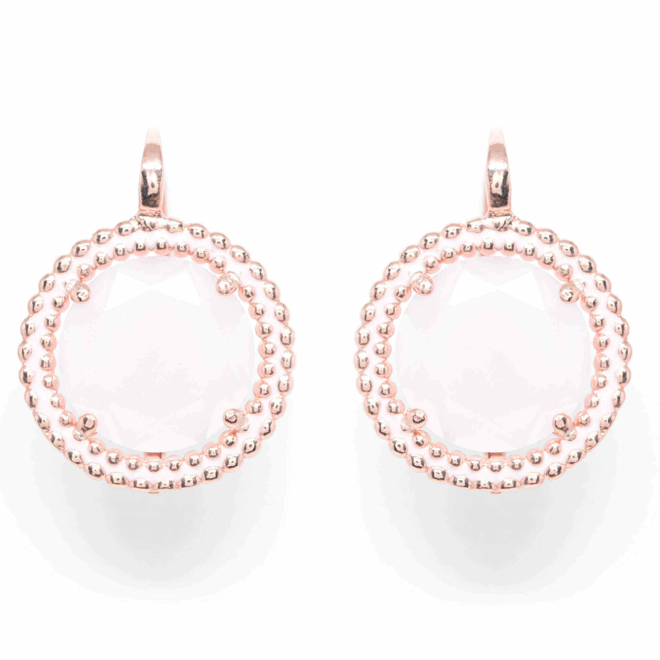 Σκουλαρίκια απο ασήμι 925 σε ροζ επιχρύσωση Κ18 με εντυπωσιακά στρόγγυλα μοτίφ από milky quartz στο χρώμα της πούδρας χαρίζοντας vintage κι εκλεπτυσμένο ύφος . Ιδανικό για all day chic εμφανίσεις.