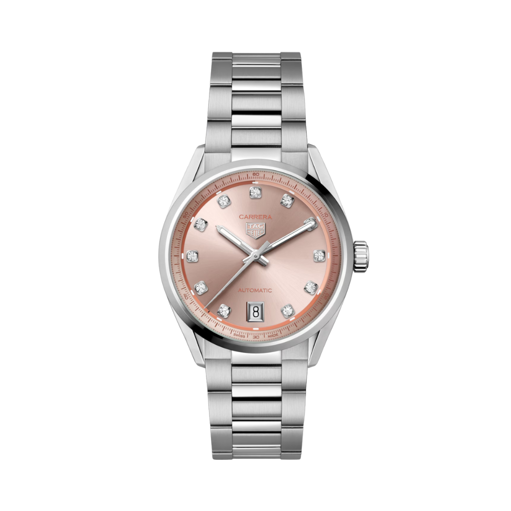Παρουσιάζουμε το TAG Heuer Carrera Date σε καντράν 36 χιλιοστών με απαλό ροζ καντράν. Αυτό το κομψό μοντέλο διαθέτει δείκτες με διαμάντια και τροφοδοτείται από τον μηχανισμό Calibre 7, καθιστώντας το πολύτιμο και διαχρονικό.